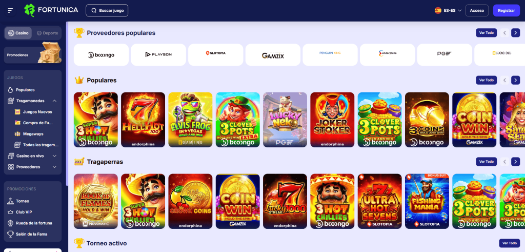 Los juegos de casino en Fortunica están organizados como las secciones de El Corte Inglés: todo bien clasificado y fácil de encontrar. Con más de 55 proveedores, la variedad es comparable a la oferta de Netflix en su mejor momento.